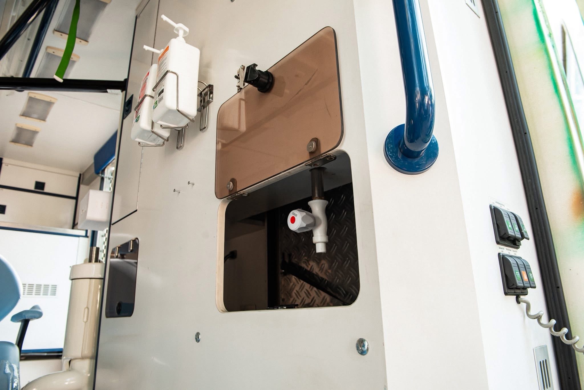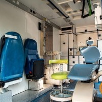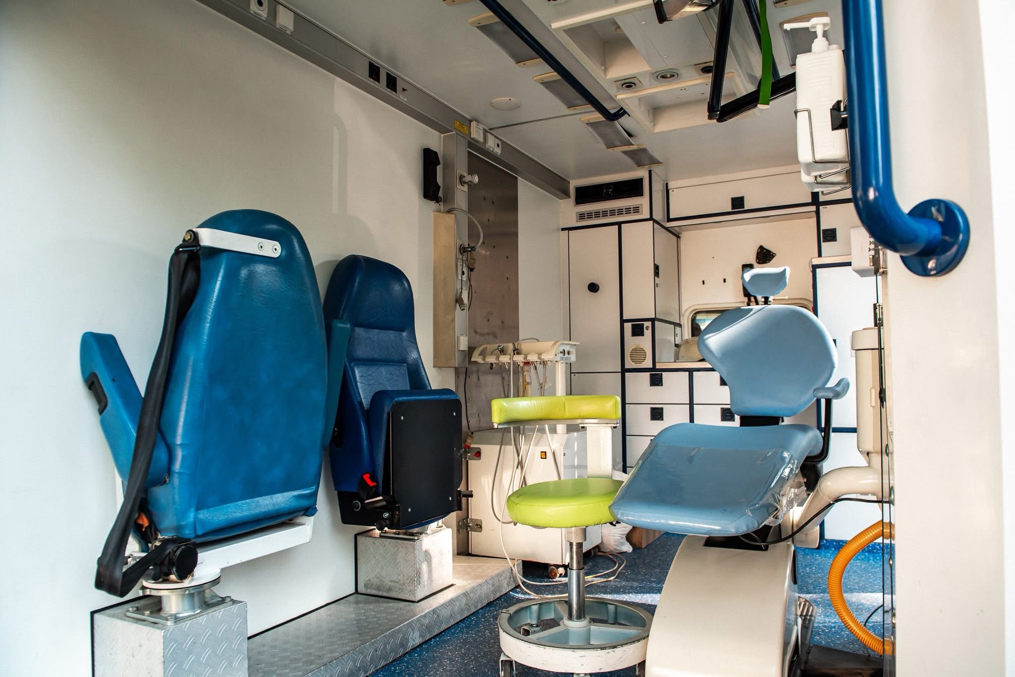 Автомобіль обладнано стоматологічним кріслом професійного рівня, сухожаровою шафою для стерилізації інструментів, комбінованою стоматологічною приставкою, вакуумною системою відсмоктування, медичним інструментарієм та витратними матеріалами. Забезпечено місця для зберігання витратних матеріалів і медикаментів, засобів індивідуального захисту для персоналу. У салоні передбачено робочі місця для стоматолога та медсестри, а також мобільні набори для термінової допомоги в польових умовах.