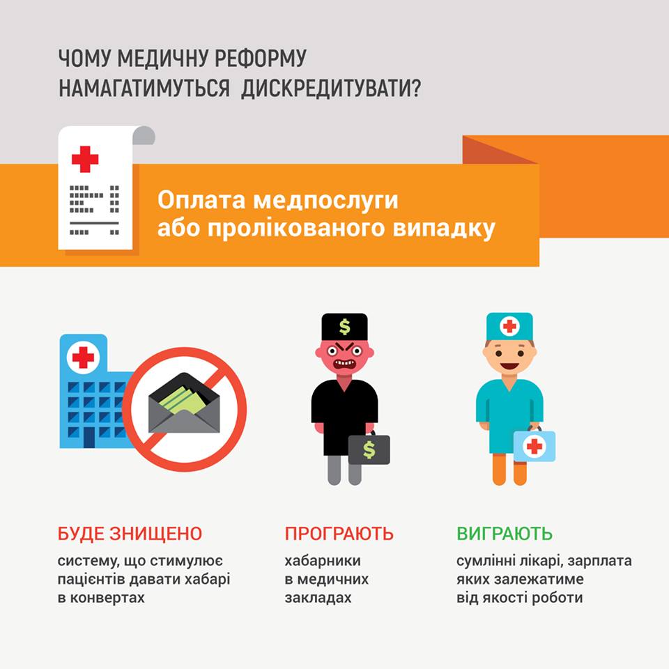 Павло Ковтонюк розповів як реформа вплине на галузь. Так, впровадження оплати за конкретну медичну послугу або пролікований випадок знищить хабарі в конвертах, які пацієнти зараз платять всім – від санітарки до головного лікаря. «Між лікарем та пацієнтом не буде готівкових розрахунків і хворого на каталці не питатимуть чи є у його родичів гроші, аби заплатити за операцію», – зазначив заступник міністра.